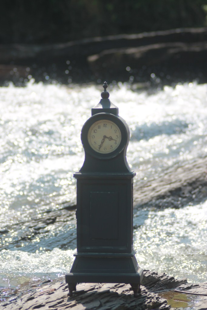 I look at the navy clock on the shelf, the one I carried in my car last year snapping photos before mountains and lakes, set in a tangle of honeysuckle along the road, and beneath the vines in the vineyards. I was compelled to do it, not entirely knowing why. It seemed important to visualize that there is a time and a season for everything. And now I see more that timing is important to obedience to God and that He has a perfect time for everything.