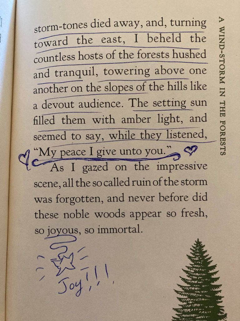 In the ER, the raging man was finally taken away and as the winds died down the doctor explained the diagnosis seemed wrong for me, the danger of death suddenly erased with his words and my opportunity to climb up during the storm dissipated into the evening. I thought of John Muir again, on the drive home. I had often thought of his climb during my own life’s storms these past two years. I imagined his ecstasy and exhilaration at being high as the winds whipped and twisted the tree tops. I could have climbed up where the promises of God reside, held on tight and let it blow, instead of cowering down low, harassed on the ground. But there will be another day, another chance to practice this path upwards, and I am going to try again– to face my storms up high….with Christ.