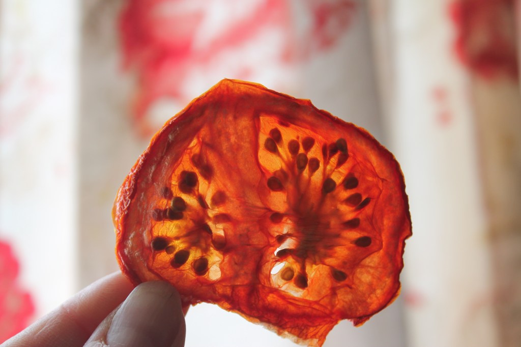 I slice the tomatoes and dry them for a day. How different they taste when not carried in a splash of water, how chewy and sweet. In my excitement I held one finished piece in the light of my window before eating it. The winter storm had changed my dead yard to a glamorous, all white stage where the tomato became a marvel before it. As if before a spotlight now, I saw the seeds exposed in their deep and secret place suspended in time, an intimate peek into a scarlet explosion in the heart of the fruit, like little, fat exclamation points, like rambunctious, young sperm in pursuit of the egg. I’m shy at the sight of it. If they had a voice I’d hear shouts of joy and the whisper of…