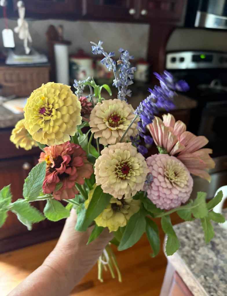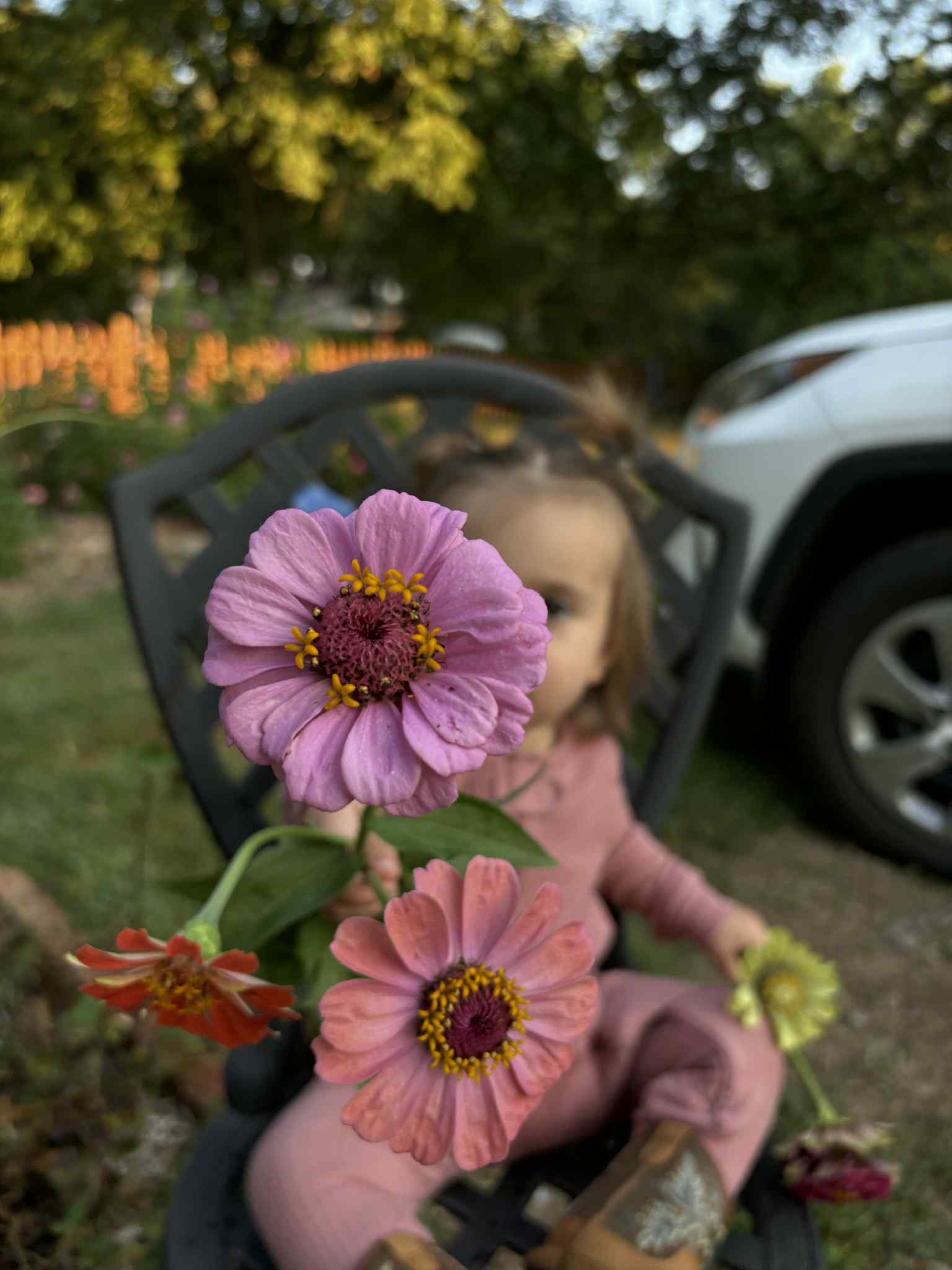 Creamy, tender skin is iridescent in morning light, plumped with life, like it’s been filled to its capacity with the morning dew. It is the small hand of the Zinnia Princess, and she is out in her garden again. She points a decisive finger at her first choice, a voluptuous, hot pink bloom.