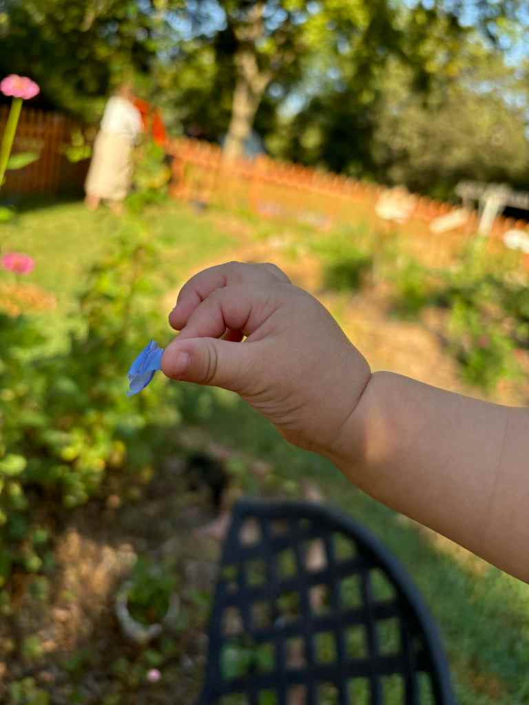 I, toting the princess on my hip, step over the stone border and enter the garden. I sit the princess down atop the mulch-covered ground and she drops her stems while reaching her hands up to hold mine. She disappears between the tomato and the okra, needing some assistance she is generously willing to take me along with her. It is a morning immersion, and she invites me along into her exploration. She is young-wise and I can easily see she feels there is much here to discover. I am intrigued.