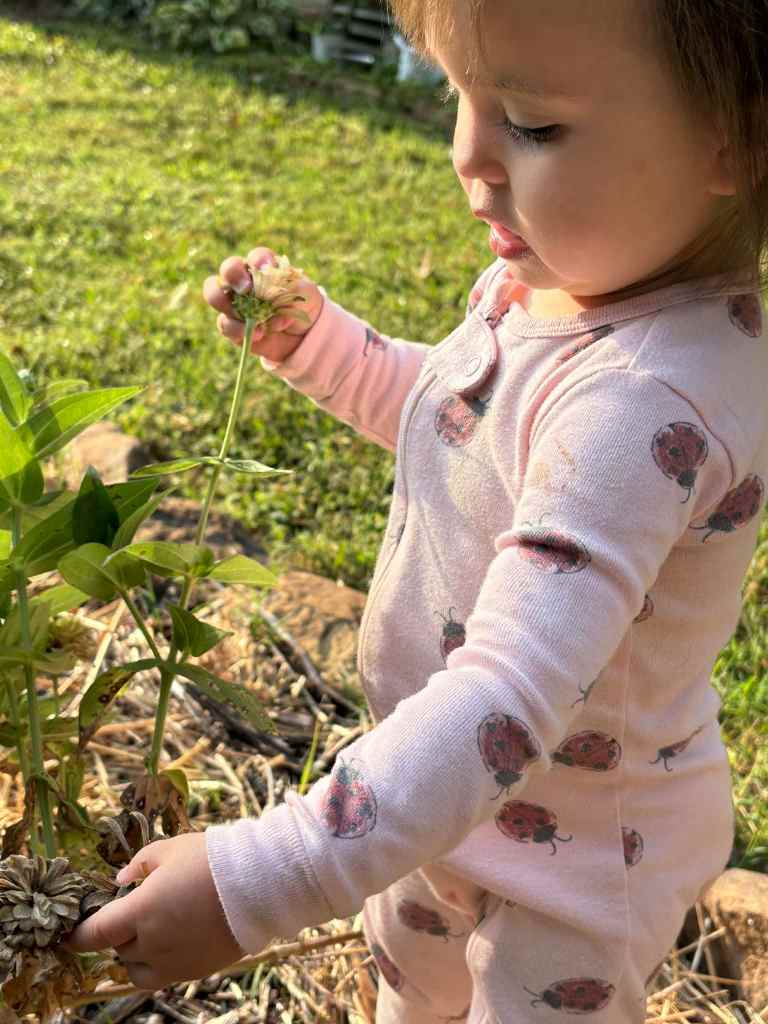 I slow myself and I follow her gaze flower to flower, and it becomes obvious to me why she has innocently insisted on a more expressive name, calling sorry eyes back to the WOW in a zinnia again. This is a most appropriate and sensible response in this dulled world, dutifully looking into the small boxes ever in our hands. She leans a soft nose straight into the brilliant color and sniffs it, pulling the subtle scent wildly into herself, and blowing it rapidly out, almost violently she breaths the scent in and out then turning her attention towards me, she points the pollen covered stamen at my face and demands I do the same. So, I do.
