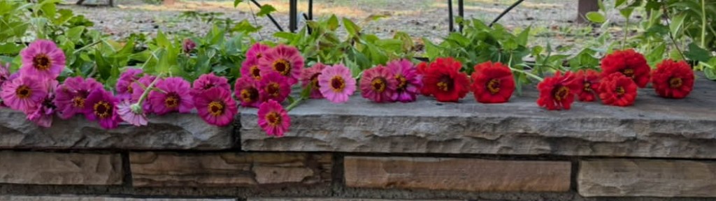 I carry her around the south side where a red zinnia wower blooms scantily along the picket fence painted a cedar color. Only three red blooms today. She will not pick any of these.